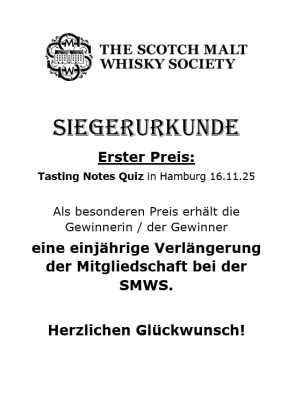 Beim ersten Mal bestand der erste Preis noch aus drei Miniaturen von SMWS-Abfüllungen. Aber diesmal konnte sich der Preis wirklich sehen lassen: Der Sieger durfte sich eine von vier exklusiven SMWS-Abfüllungen aussuchen und erhielt zudem eine einjährige Verlängerung seiner SMWS-Mitgliedschaft - ein absoluter Traum für Whisky-Liebhaber.